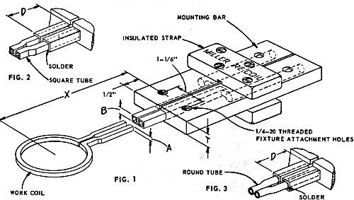 To install, locate coil in relation to fixture and coil mounting bars. (See Fig. 1). Insert coil ends into tubing opening a minimum distance of 3/4" (See Fig. 2). Distance "X" from center of work coil to center of fixture attachment holes is determined by depth of insertion of work coil ends. When properly located, soft solder, clean and pressure test for leaks and flow before use.